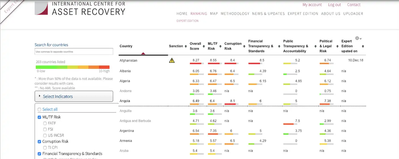 The interactive Expert Edition ranks 203 countries according to their risk of money laundering and terrorist financing. Regularly updated, it includes 14 sub-indicators that help users gain a more detailed understanding of a country’s risk of money laundering and terrorist financing.