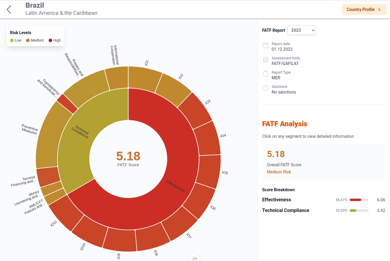 Users can rank countries or jurisdictions according to their results in the FATF’s 40 Recommendations (R) and 11 Immediate Outcomes (IOs). The scores are presented both separately and aggregated. The data is presented on two levels: